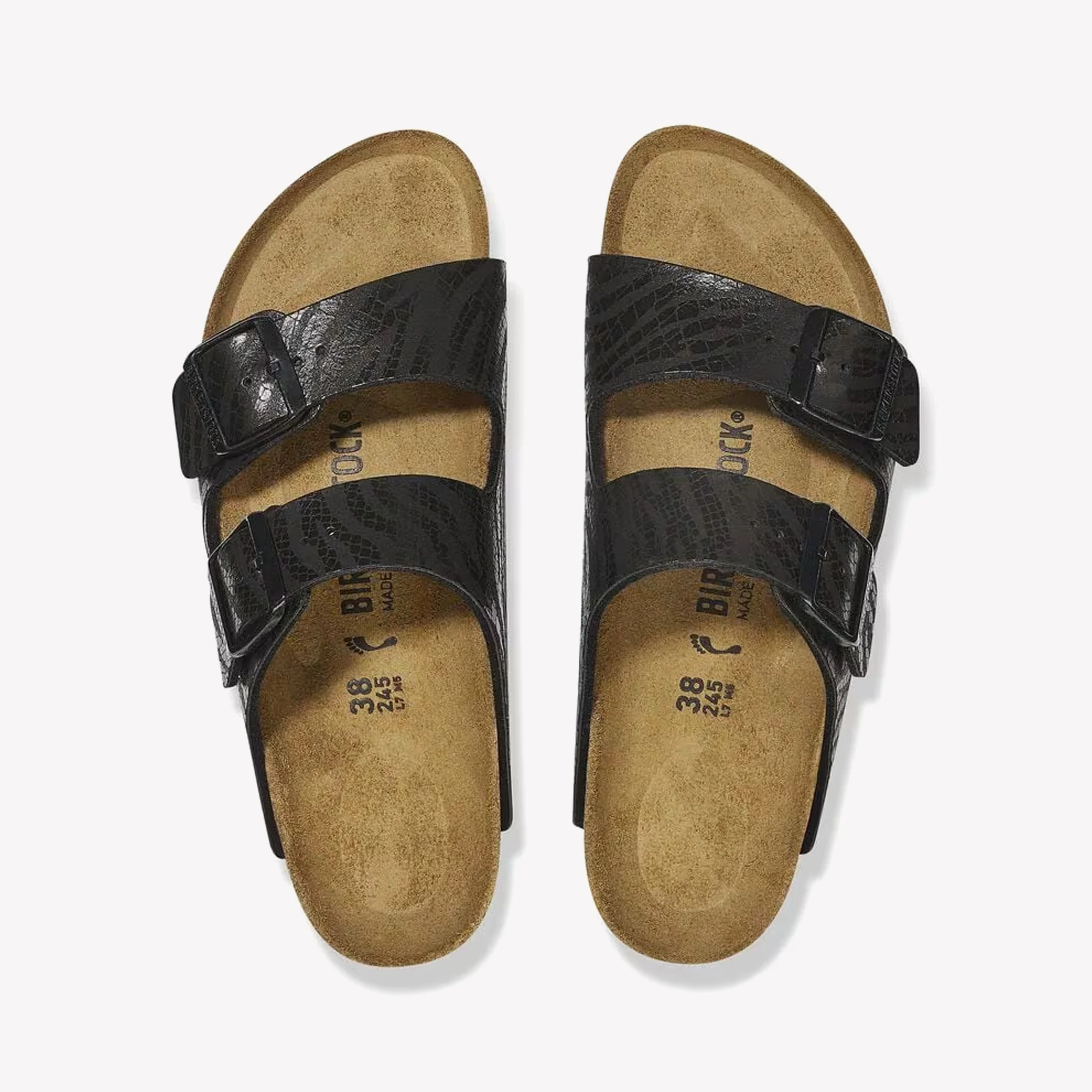 The BIRKENSTOCK Arizona is a genuine classic that has been delighting both men and women for decades. This individually adjustable two-strap sandal has long held cult status. This version features a zebra look and is a real eye-catcher. The upper is made from a skin-friendly, synthetic material with a velvety feel.